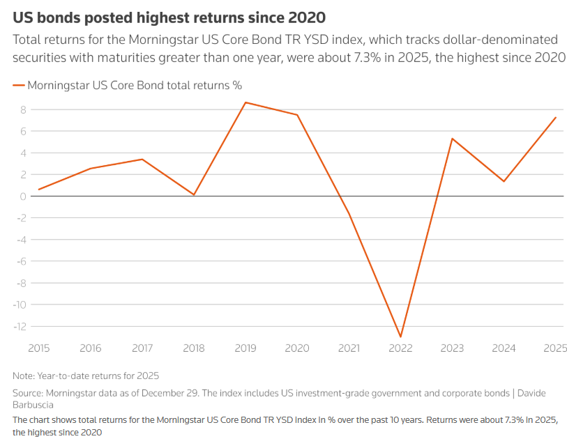 最新统计数据显示,追踪发行期限超过一年且以美元计价债券资产的Morningstar US Core Bond TR YSD指数在2025年的总投资回报约为7.3%,创下自2020年以来最强劲投资回报。该基准指数包含美国国债以及投资级公司债。