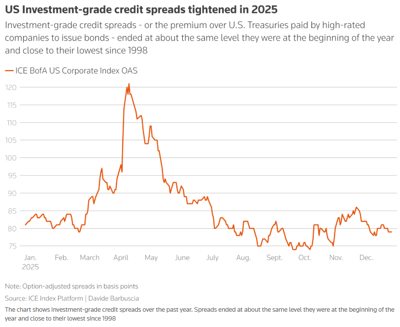 2025年,美联储降息周期——全年累计下调75个基点——可谓大幅推动了今年的美国国债价格大举反弹,因为更低的政策利率会大幅压低收益率,并使存量债券(由于其相对更高的票息支付)更具配置价值。在美国公司债市场方面,美国经济的韧性支撑了企业利润,使投资者们为持有公司债而非美国国债所要求的额外收益率维持在接近历史低位,意味着公司债价格回报在2025年格外强劲,不过也有例外——位于“AI泡沫风暴”最核心位置的甲骨文投资级公司债因业绩前景过于依赖处于亏损状态的OpenAI以及创纪录发债规模而大幅下跌。